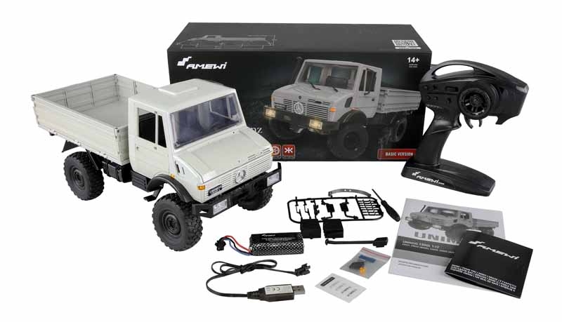 Als RTR-Version (Ready-to-Run) erhältlich, ist im Lieferumfang – bis auf haushaltsübliche Batterien für die Fernsteuerung –, bereits alles enthalten, was für den Betrieb des Unimogs benötigt wird.