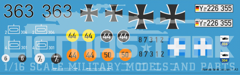 Der Decalsatz Leopard 1 A3 beinhaltet Beschriftungen für den Leopard 1 A3 im Maßstab 1/16