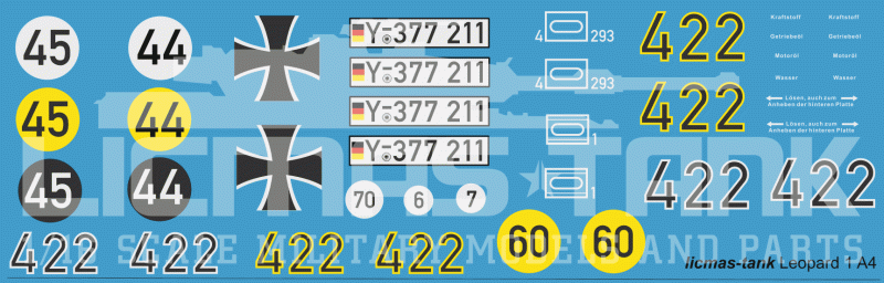 Der Decalsatz Leopard 1 A4 beinhaltet Beschriftungen für den Leopard 1 A4 im Maßstab 1/16