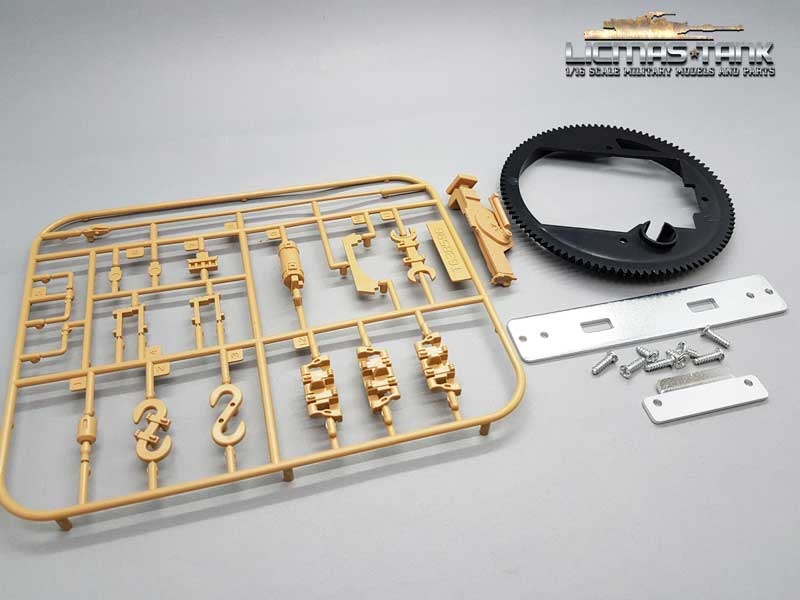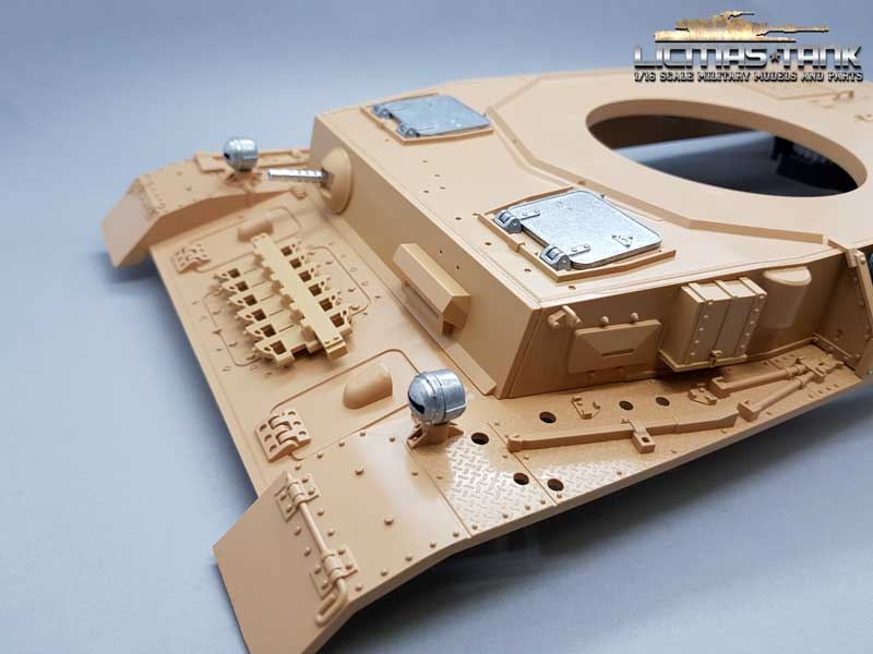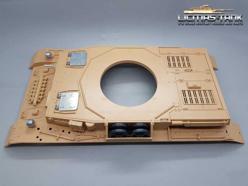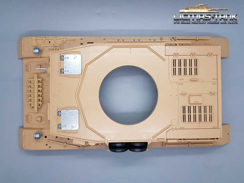 1 x Oberwanne mit Metall MG, Metall Scheinwerfer, Metall Luken und Anbauteilen mit 360 Grad Kunststoff Drehkranz und Metall Halterungen zur Befestigung an die Panzer 4 Metall Unterwanne von Taigen.