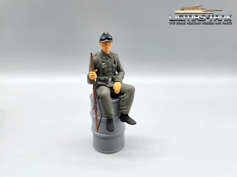 Diese Aufsitzer Figur aus Resin stellt einen detaillierten, unbemalten Aufsitzer mit Waffe dar – speziell passend für das Halbkettenfahrzeug Sd.Kfz. 251/1 Ausf. D im Maßstab 1:16.