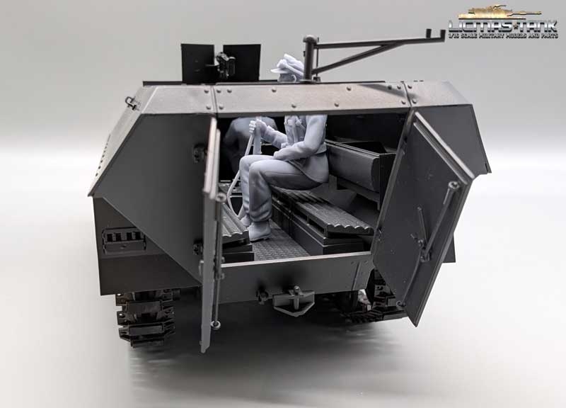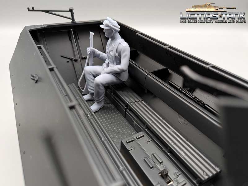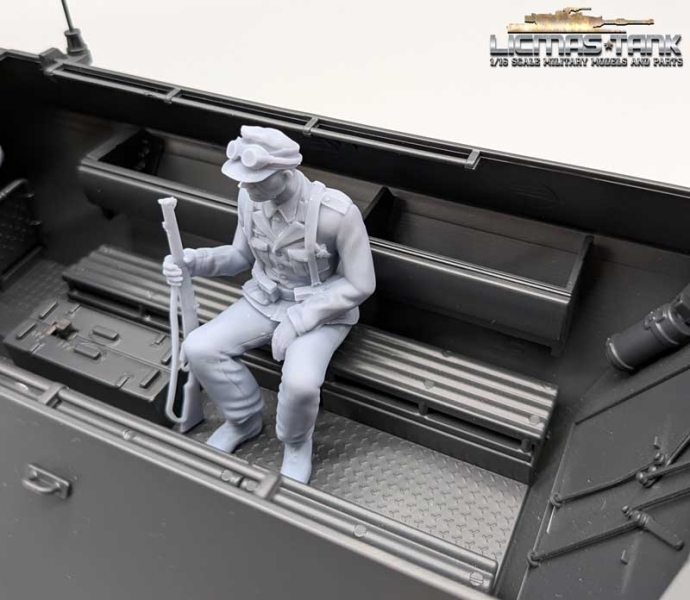 Diese Aufsitzer Figur aus Resin stellt einen detaillierten, unbemalten Aufsitzer mit Waffe dar – speziell passend für das Halbkettenfahrzeug Sd.Kfz. 251/1 Ausf. D im Maßstab 1:16.