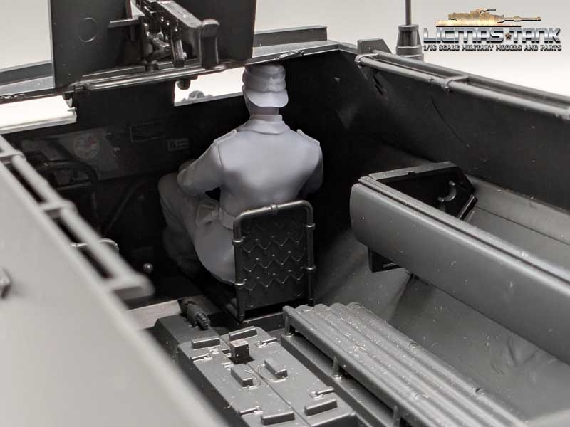 Diese Figur aus Resin enthält einen detaillierten, unbemalten Beifahrer – speziell passend für das Halbkettenfahrzeug Sd.Kfz. 251/1 Ausf. D im Maßstab 1:16.