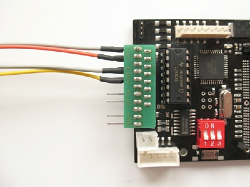 Der Adapter wird auf den 8-poligen Anschluss für Turmgruppe des Panzermoduls aufgesteckt (siehe Bild). Die einzelnen Steckverbindungen und deren Polarität sind auf der Platine beschriftet.