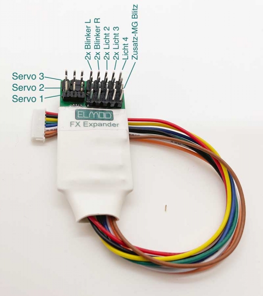 ElMod FX Expander erweitert eine ElMod FusionX oder eine ElMod 4WD um Blinkerfunktion, drei weitere schaltbare Lichtquellen und drei Servoanschlüsse.