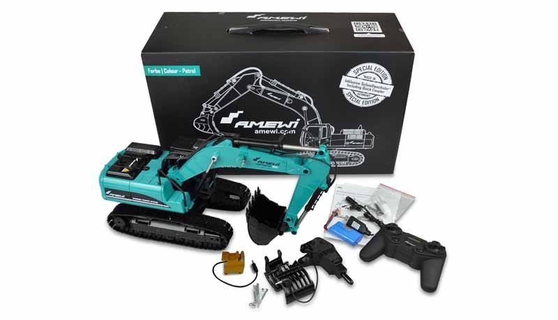 Exklusiver Amewi Vollmetall Bagger in einer Sonderlackierung und einem elektronischen Schnellwechsler made in Germany