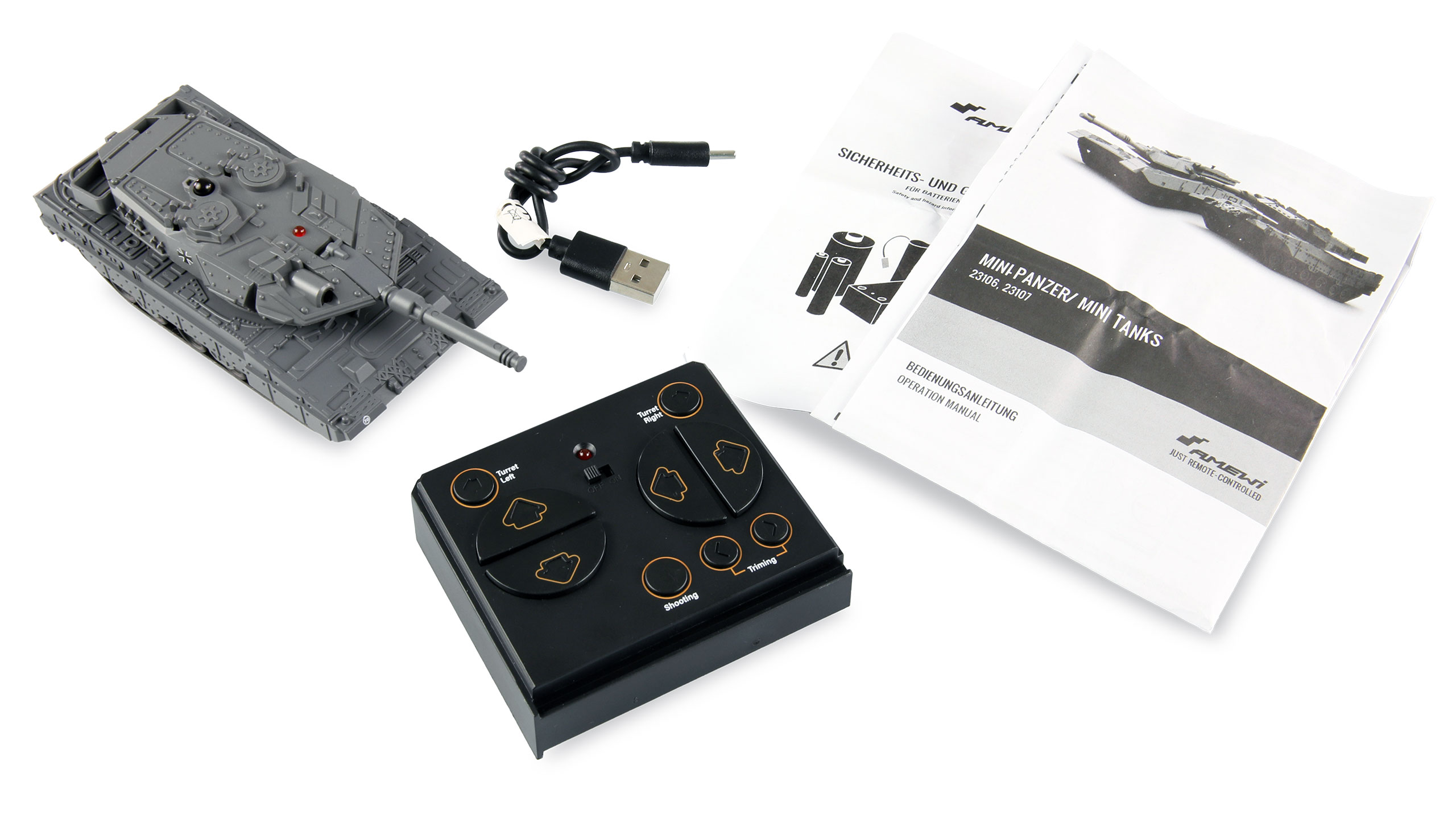 Mit dem verbautem Li-Ion Akku sind Fahrzeiten von bis zu 15 Minuten möglich. Die bequem per Knopfdruck einstellbare Richtungstrimmung sorgt für einen guten Geradeauslauf. Der Mini-Panzer wird mit einem USB-C-Ladekabel aufgeladen. Für die Inbetriebnahme werden lediglich noch 2x AAA Mignon Batterien benötigt – schon kann der Einsatz beginnen.