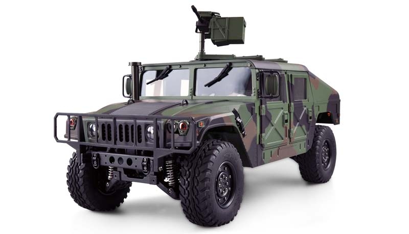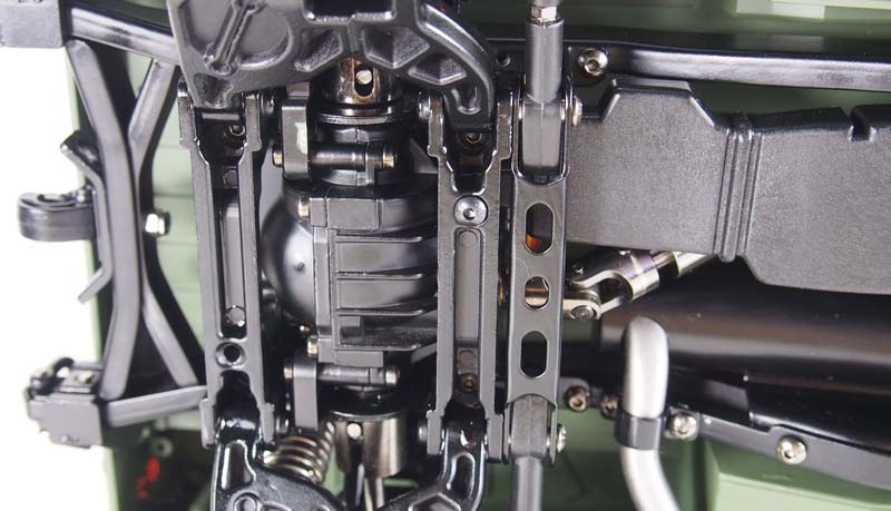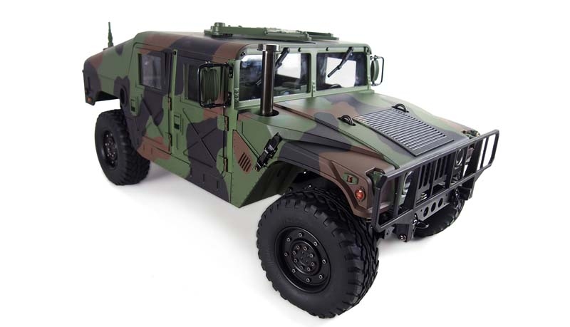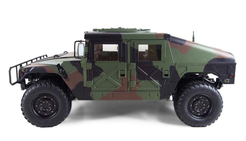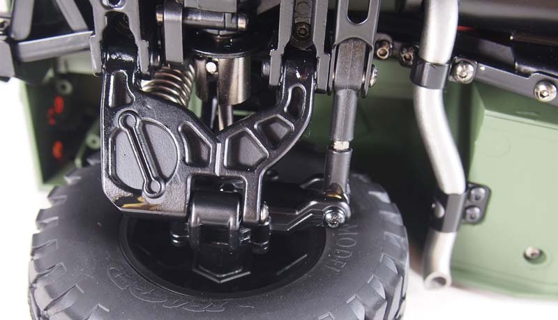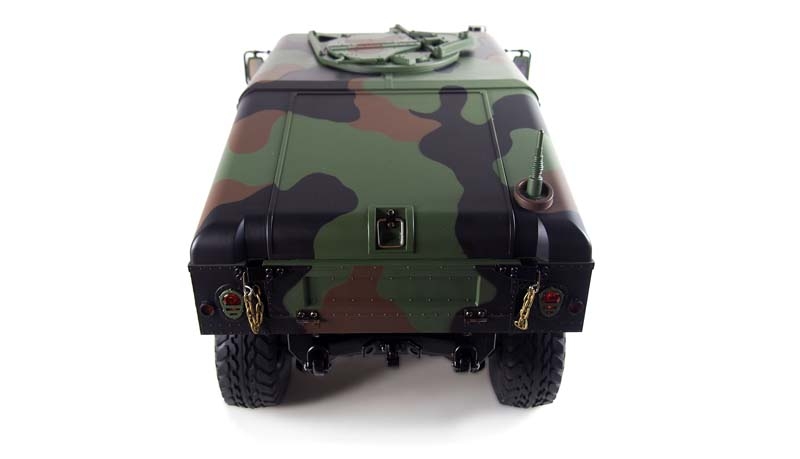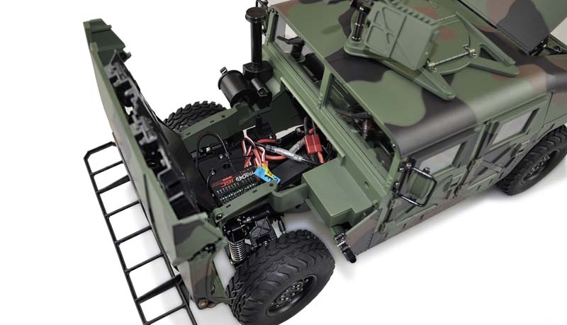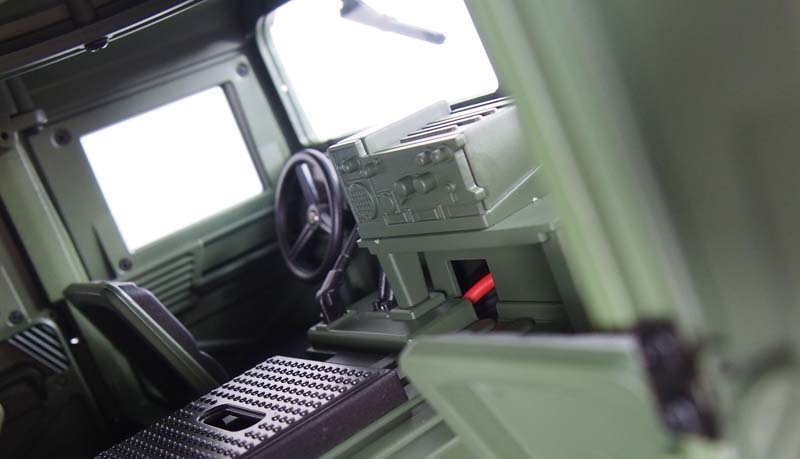Ein technisches Meisterwerk aus Teilmetall als wunderbarer Scaler mit vielen Anbauteilen und etlichen Details. Ready-to-Run (RTR) Dieses edle Fahrzeug im Maßstab 1:10 setzt neue Maßstäbe durch eine unglaubliche Detailtreue und durch tolle Technik. das Modell besticht durch eine perfekte Lackierung, ein 2-Gang schaltgetriebe, ein vollständig geschütztes Fahrwerk, eine wassergeschützte Elektronik, viel optionales Zubehör wie Sound- oder Lichtmodul. Portalachsen und ein Scalefahrwerk mit komplettem Scale Unterboden gehören ebenfalls zur Serienausstattung dieses Geländefahrzeuges. Alle Türen sind von außen bequem zu öffnen und der Innenraum ist komplett ausgebaut (sogar die Sitze sind mit einer gummierten Oberfläche veredelt) Die Heckklappe ist mit 2 Metalldämpfern ausgestattet, die die Klappe geöffnet halten. Die Motorhaube ist sogar mit 2 seitlichen Metallverriegelungen ausgestattet. Darunter befindet sich eine Scale Motorattrappe und der Empfänger mit 16 Kanälen. Vom Sender (ebenfalls 16 Kanäle) sind folgende Funktionen zusätzlich steuerbar: Licht, Sound, Smoke, Winde, Lenkung (bei umbau auf Mehrachs- lenkung) usw. Es zudem noch einige freie Kanäle, nachträglich noch das ein- oder andere optionale Zubehörteil angebaut werden soll. Im Dach ist eine aufklappbare Luke für den MG Schützen.Features
