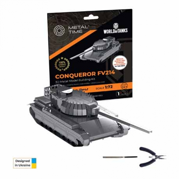 Der FV 214 "Conqueror" verfügt über das erkennbare Design eines schweren Panzers: einzigartige Turmform, langes Hauptgeschütz, Maschinengewehre, Kommandantenturm, Luken, Munitionsbunker und achtrolliges Fahrgestell mit zwei Antriebsrädern. Die Oberflächen sind durch elektrochemisches Ätzen strukturiert und geätzt, so dass das Modell wie das Originalfahrzeug aussieht. Alle Details sind aus rostfreiem Stahl gefertigt, der in der Lebensmittelindustrie, bei Konsumgütern und Spielzeug verwendet wird. Der Zusammenbau des FV 214 "Conqueror" schließt eine Gefährdung des Besitzers aus. Der präzise Zuschnitt ermöglicht den Zusammenbau des Modells ohne zusätzliches Werkzeug, Löten und Kleben.
