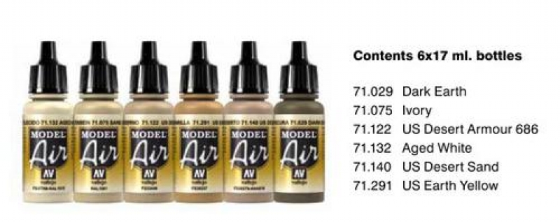 Das Set umfasst sechs Farben in 17 ml Fläschchen: Dark Earth, Ivory, US Desert Armor 686, Aged White, US Desert Sand und US Earth Yellow.