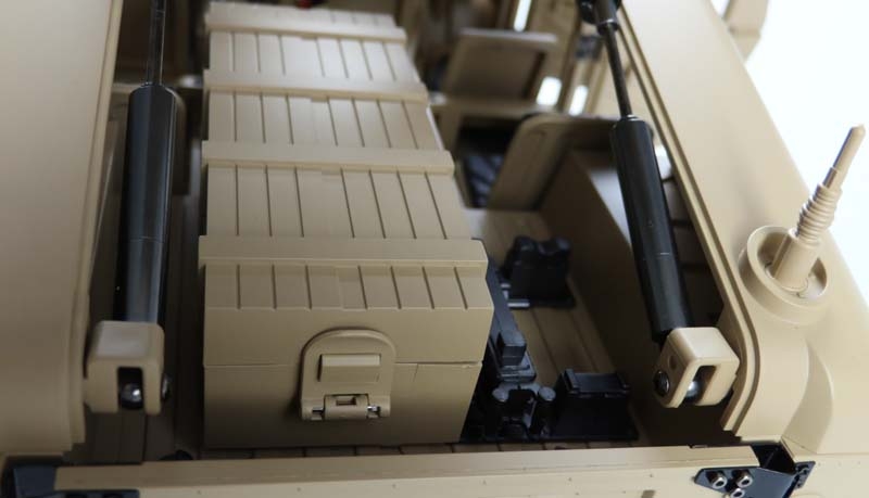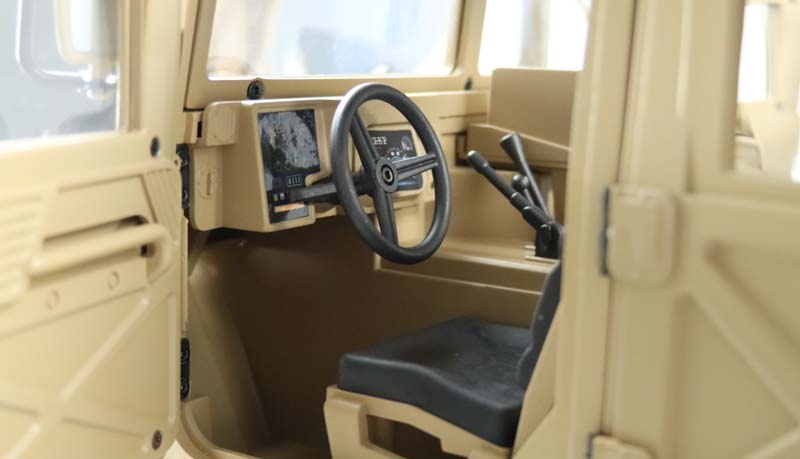 Portalachsen und ein Scalefahrwerk mit komplettem Scale Unterboden gehören ebenfalls zur Serienausstattung dieses Geländefahrzeuges. Alle Türen sind von außen bequem zu öffnen und der Innenraum ist komplett ausgebaut (sogar die Sitze sind mit einer gummierten Oberfläche veredelt) Die Heckklappe ist mit 2 Metalldämpfern ausgestattet, die die Klappe geöffnet halten. Die Motorhaube ist sogar mit 2 seitlichen Metallverriegelungen ausgestattet. Darunter befindet sich eine Scale Motorattrappe und der Empfänger mit 16 Kanälen. Vom Sender (ebenfalls 16 Kanäle) sind folgende Funktionen zusätzlich steuerbar: Licht, Sound, Smoke, Winde, Lenkung (bei umbau auf Mehrachslenkung) usw. Es zudem noch einige freie Kanäle, nachträglich noch das ein- oder andere optionale Zubehörteil angebaut werden soll. Im Dach ist eine aufklappbare Luke für den MG Schützen.