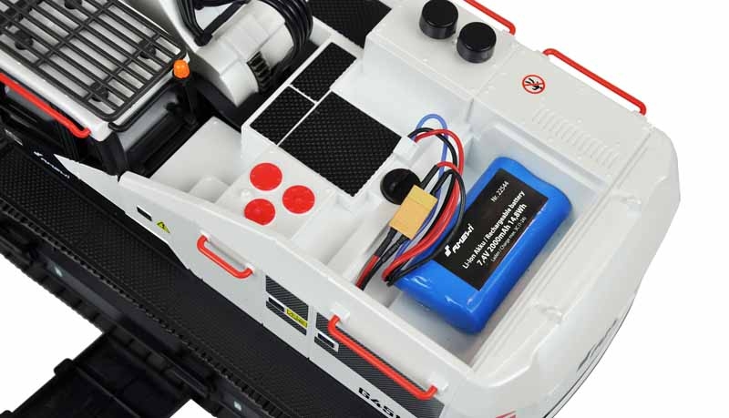der einzelnen Komponenten. Zusätzlich liegt dem Bagger ein Holzgreifer, ein elektrischer Bohrhammer und ein Schrotgreifer bei. Somit kann das Modell mit wenigen Handgriffen umgebaut und den aktuellen Bedürfnissen angepasst werden. Die Schaufel ist aus Metall gefertigt und hat ein hohes Fassungsvermögen. Die Antriebsketten sind aus Metall und das Modell verfügt zudem über kräftige Stellmotoren, welche auch schwere Lasten problemlos bewältigen. Die Qualität und die Detailtreue dieses Modells sind als RTR Modell in dieser Größe perfekt abgestimmt. Weiter wurden bei diesem Modell die Spindelantriebe aus den hochwertigen Vollmetall Baggern mit Endschaltern verbaut. Der Vorteil dieses Antriebssystems in Verbindung mit den Metallketten ist das große + an Gewicht und der damit verbundenen Kraft des Auslegers. Somit lässt sich auch festeres Material problemlos bewegen. Die Lieferung des Modells erfolgt in einer sehr stabilen und Formschönen geschäumten Box mit einzelnen Fächern für alle enthaltenen Komponenten.