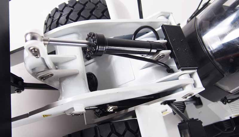 Das Herz der Hydrauliksteuerung ist eine Brushless-Hochleistungspumpe mit Überströmventil und einem Durchfluss von ca. 400ml/min. Zusätzlich ist das System mit 3-Wege-Umschaltventilen und einem Luft-Ölkühler ausgestattet. Gesteuert wird der Radlader über eine hochwertige proportionale 2,4GHz Fernsteuerung. Insgesamt können zehn Funktionen bedient werden. Vorne und hinten über helle LED-Scheinwerfer verfügend, steht dem Einsatz auch in der Dämmerung und nächtlichen Dunkelheit nichts im Wege.