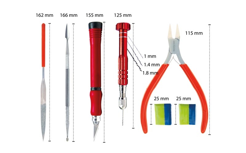 - Enthält auch: Hobbyfeile, Hobbymesser, Grünzeug (2 Stück), Hobbybohrer (3 Bohrer), Hobby-Seitenschneider, Bildhauerwerkzeug