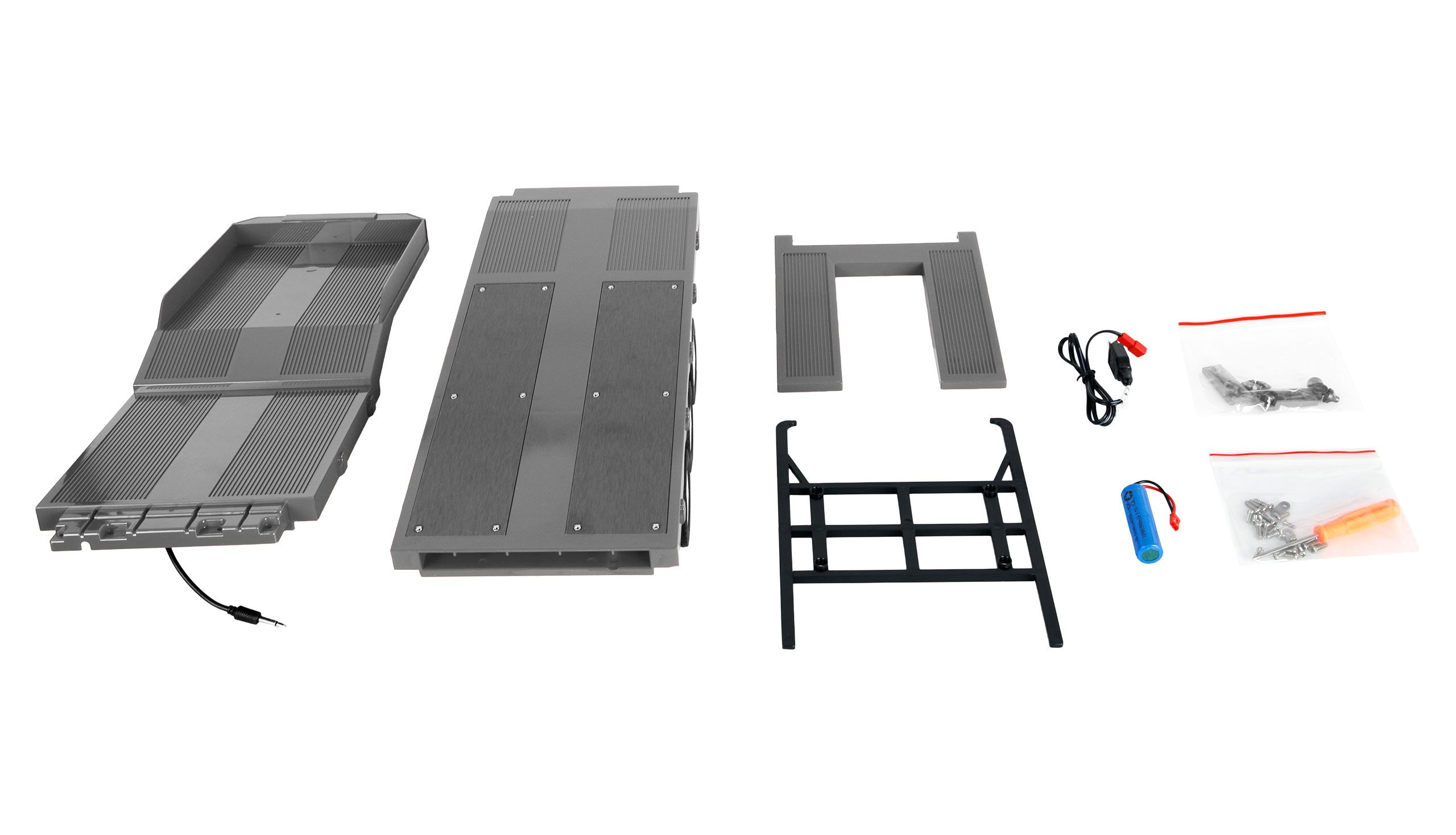 Der Tieflader-Sattelauflieger Dreiachser ist die ideale Ergänzung zur Scania 770S Zugmaschine im Maßstab 1:18. Der Auflieger lässt sich direkt mit der Fernsteuerung des Fahrzeugs bedienen und ermöglicht so ein realistisches und komfortables Zusammenspiel zwischen Zugmaschine und Trailer. Dank der elektronisch steuerbaren Rampen und Stützen können diese präzise auf- und abgefahren werden, was das Be- und Entladen sowie das An- und Abkoppeln besonders einfach macht. Eine integrierte LED-Beleuchtung sorgt zusätzlich für eine authentische Atmosphäre – besonders eindrucksvoll bei Fahrten in gedämpftem Licht.