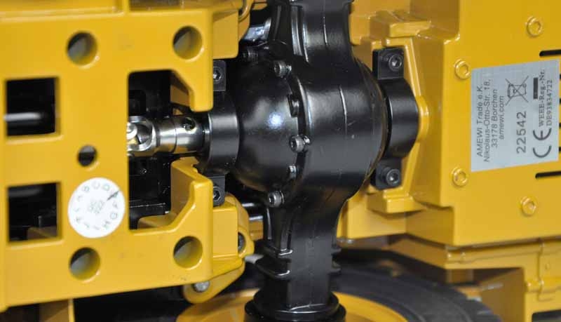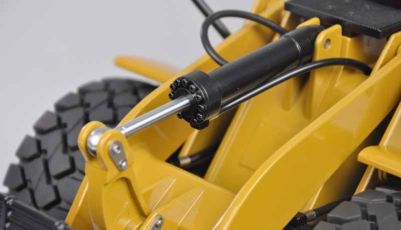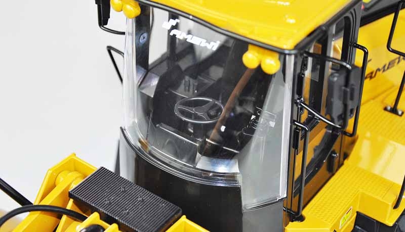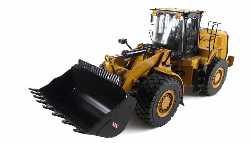 Hydraulic scale replica of a well-known wheel loader in full metal and yellow paint, which provides an exceptional driving experience with lockable differentials, 2-speed manual gearbox and oscillating axle. Weighing approx. 11kg, this 1:16 scale construction machine can be moved on almost any surface thanks to its solid rubber tyres. The power of the boom, the brushless drive and the hydraulically controlled bucket are above average in comparison to its own weight and enable trouble-free working even with heavy material such as earth, gravel or other bulk material.