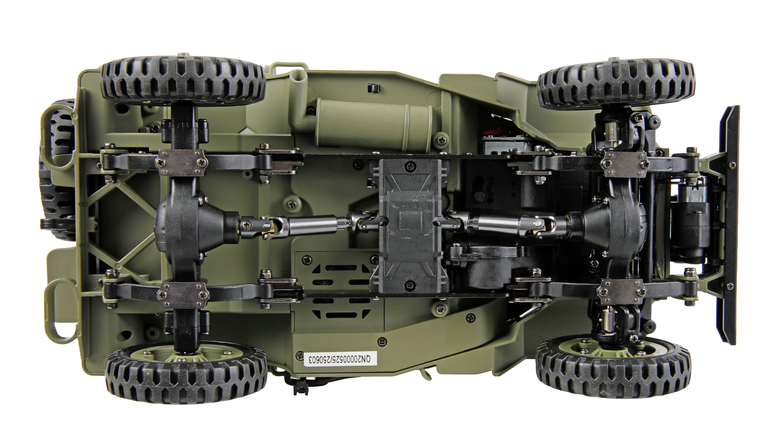 The Jeep Willys MB Scale Crawler in 1:14 scale is a detailed replica of the legendary off-road vehicle that became known during World War II as a robust and versatile emergency vehicle for the US Army. This remote-controlled model combines authentic design with modern RC technology and offers a realistic driving experience on any terrain.