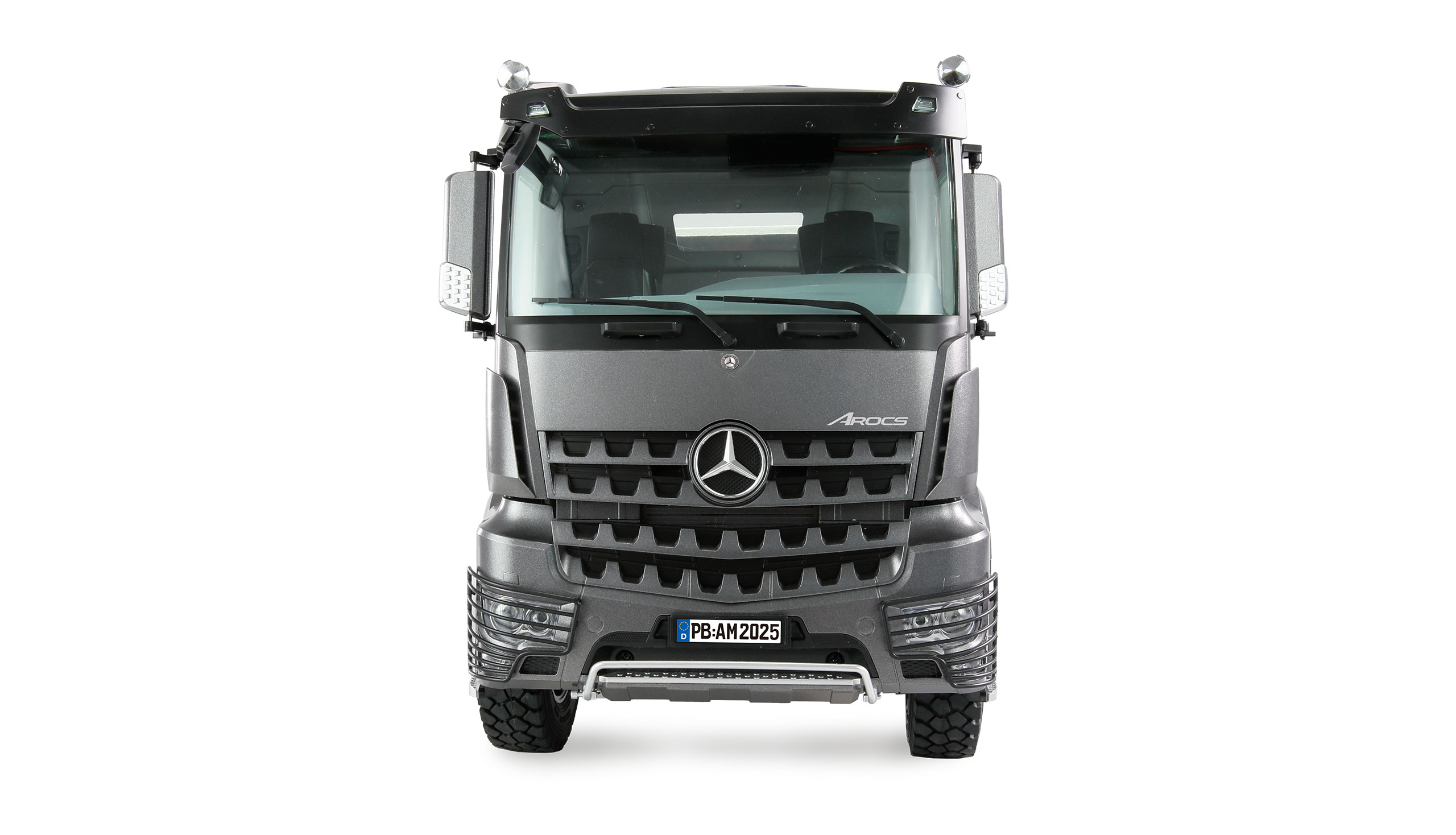 This licensed truck from the Mercedes-Benz Arocs series is a convincing 4x4 model with an electrically operated tipping function via a worm gear: with its detailed appearance in 1:14 scale, it makes the hearts of model-making fans beat faster. The vehicle weighs 5 kilograms, and all functions can be conveniently operated via remote control. The chassis, tipper, drive train and all the shafts are made entirely of metal, which guarantees a long service life for the components. The driver's cab is reproduced to scale and equipped with a complete interior. Rubber tyres with high ground adhesion and metal wheel rims complete the appearance.