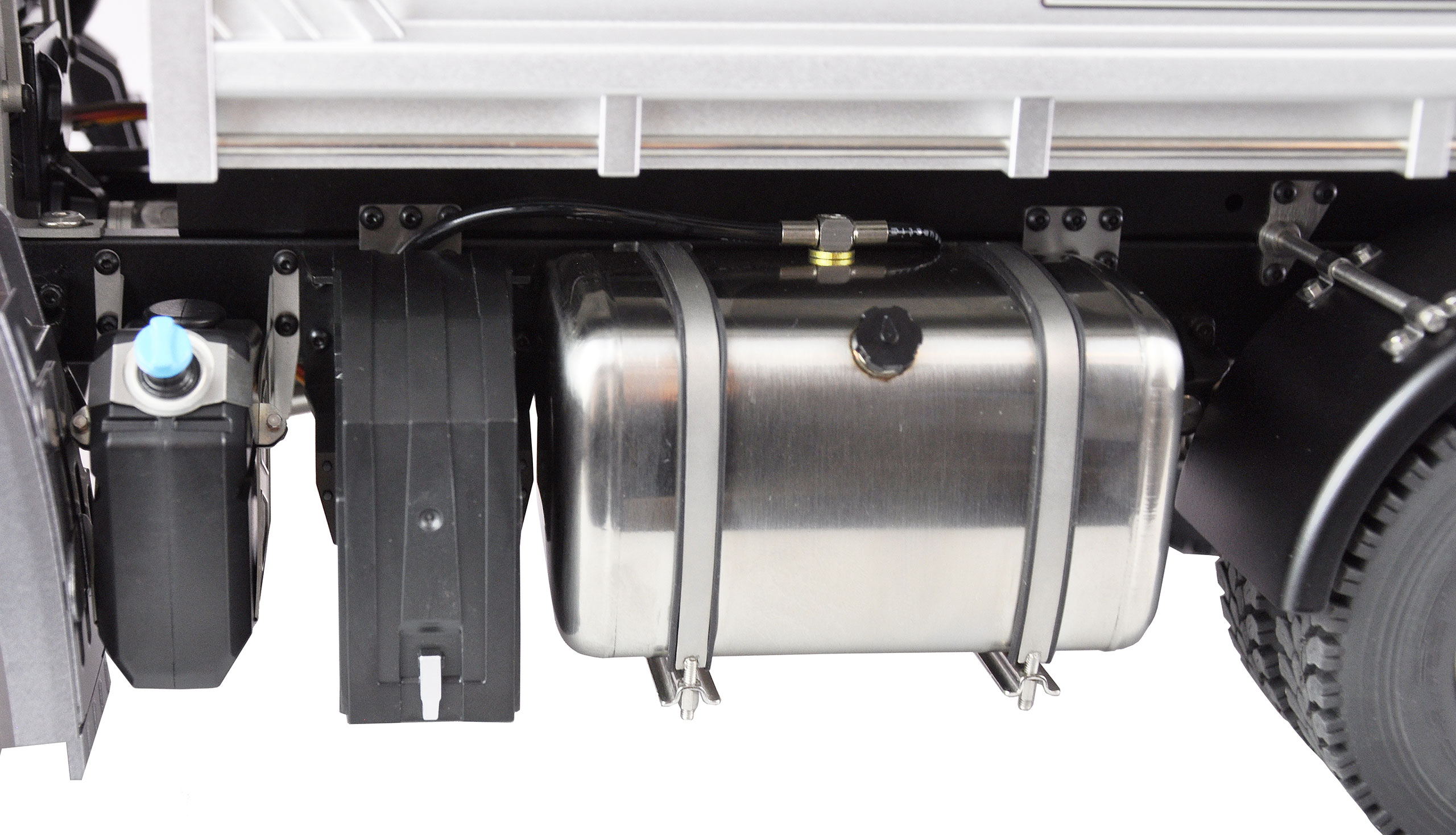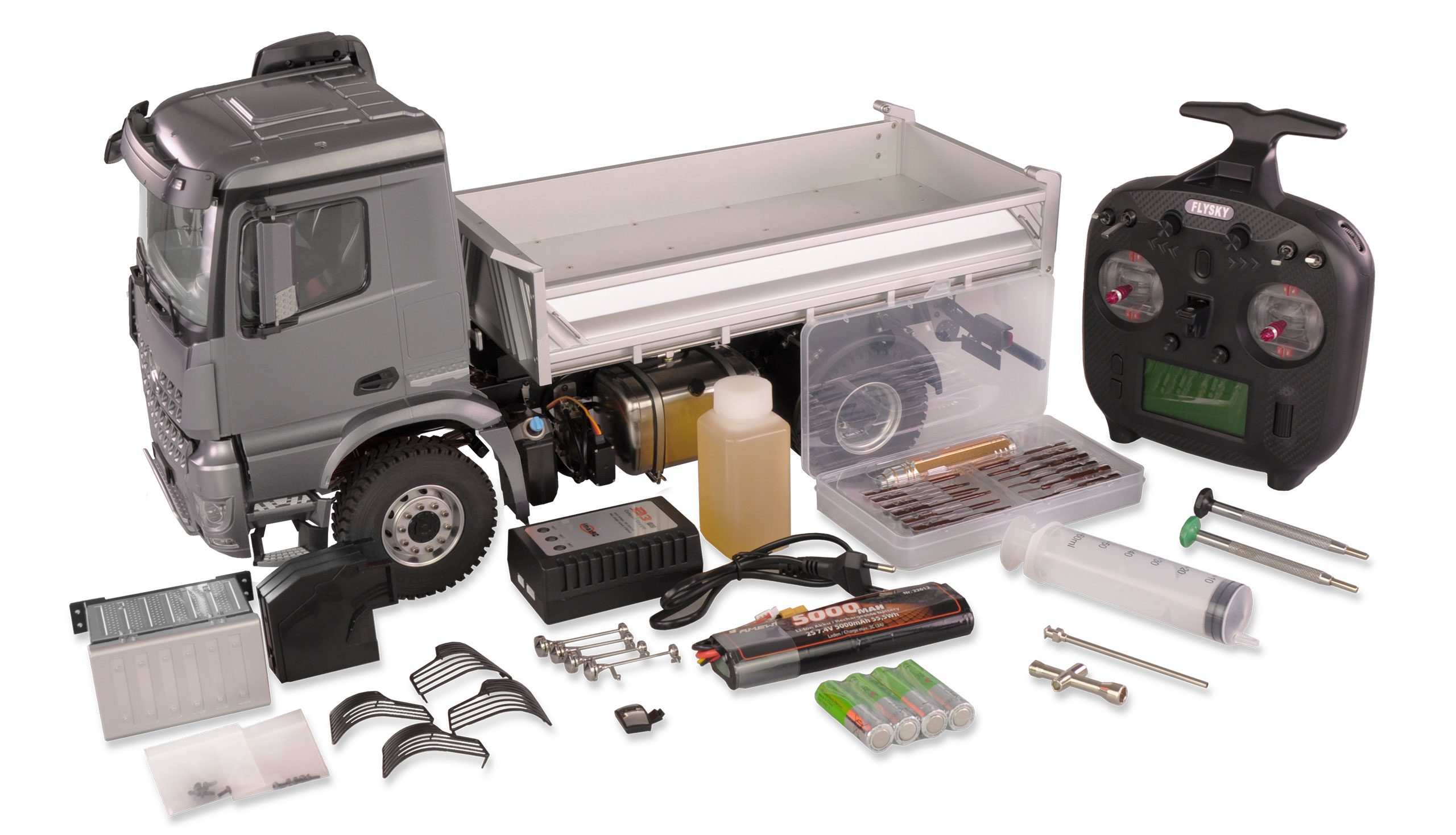 The vehicle is delivered fully assembled as an RTR version (Ready-to-Run) in a safe transport box. Only a few attachments need to be glued on and the hydraulic oil filled in - after charging the battery and inserting the transmitter batteries, the first drive can be taken immediately.