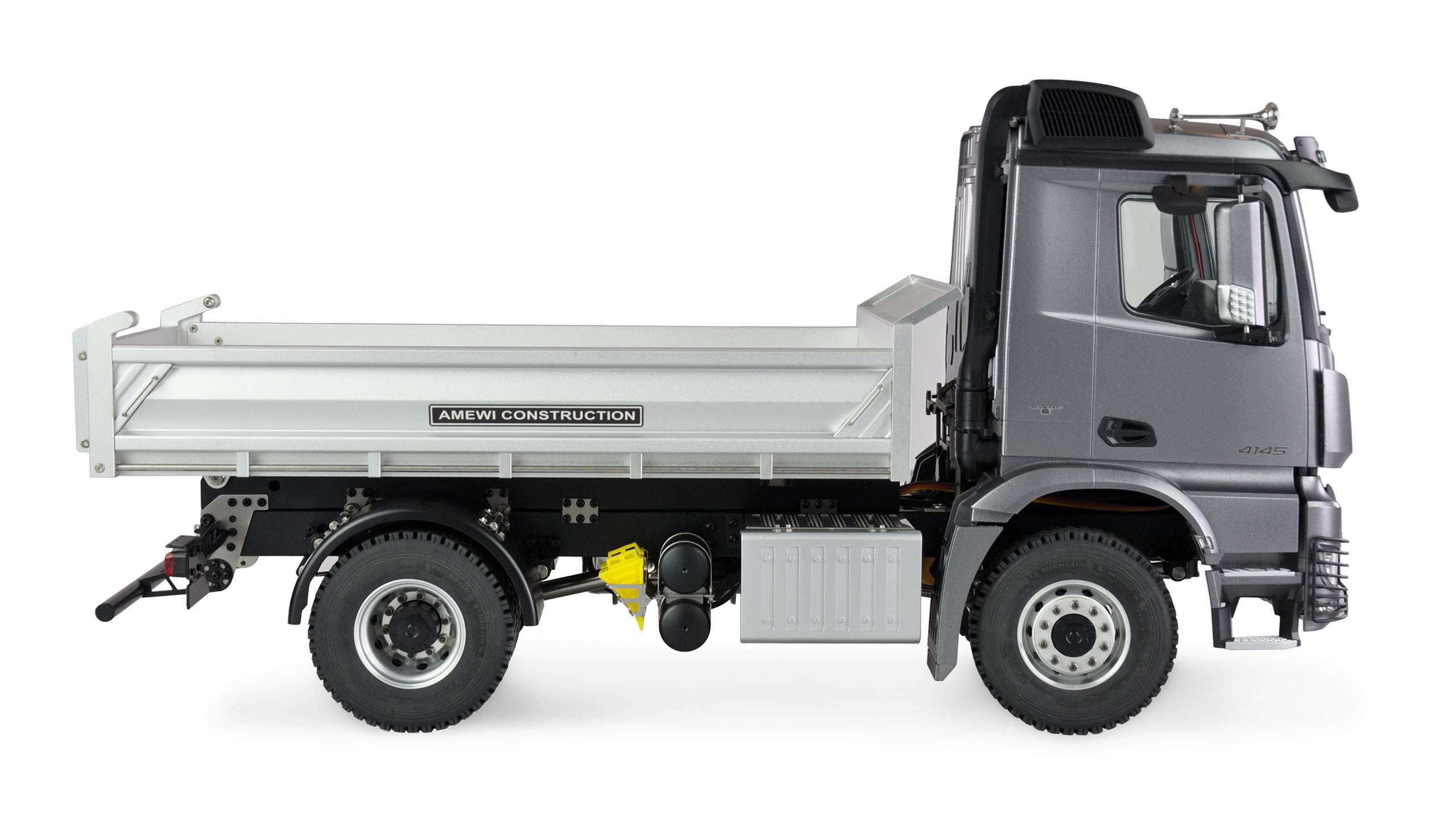Exclusive licence truck from the Mercedes AROCS series, which impresses as a 4x2 model with hydraulically operated tipping function and makes the pulse of model builders beat faster thanks to its scale optics in 1:14 scale. All functions of the vehicle, which weighs in at 6.9 kg, can be controlled via the transmitter. Chassis, body, the entire drive train and all shafts are made of metal. This ensures maximum durability of the components. The scale driver's cab with complete interior as well as the scale high-grip rubber tyres incl. scale rims made of metal round off the high-quality appearance.