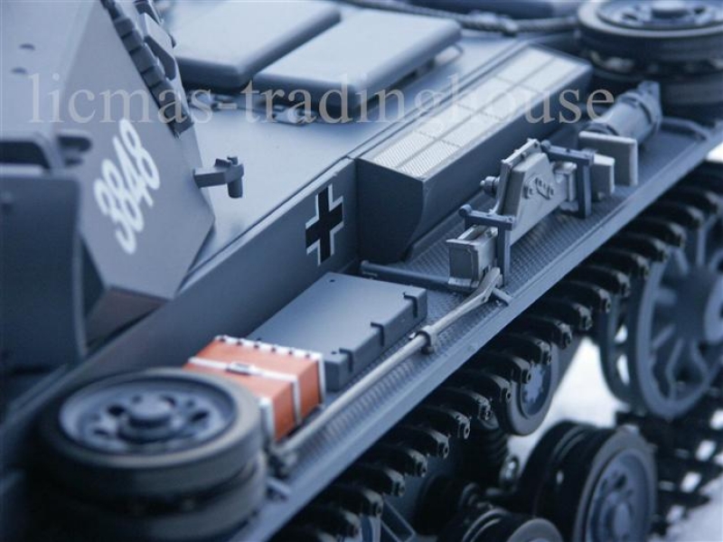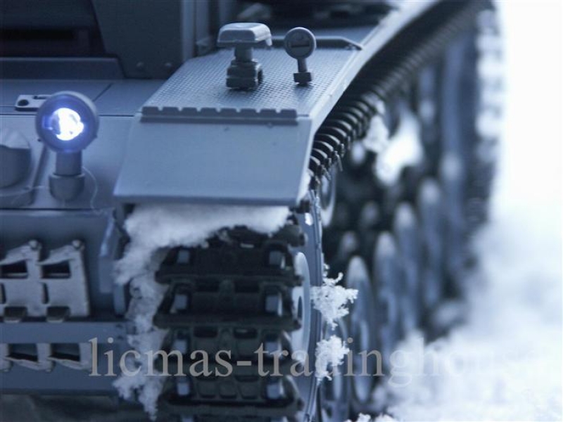 The powerful model has a 2.4 GHz remote control and receiver. The power motors with optimized torque give the Panzer III a precise and smooth steering system. Nylon gears with an improved gear ratio provide higher power. The proportional control allows you to start the tank very slowly and increase the speed smoothly. The Panzer III moves forwards and backwards, also with a left and a right turn. It can also be turned left or right on the spot. You can lift and lower the gun and rotate the turret 320 degrees (160 degrees each side). Various engine noises and smoke fumes from the mufflers round off the realistic experience.